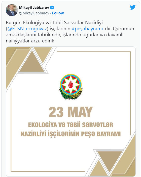 İqtisadiyyat naziri Mikayıl Cabbarov Ekologiya və Təbii Sərvətlər Nazirliyi işçilərinin peşə bayramını təbrik edib.