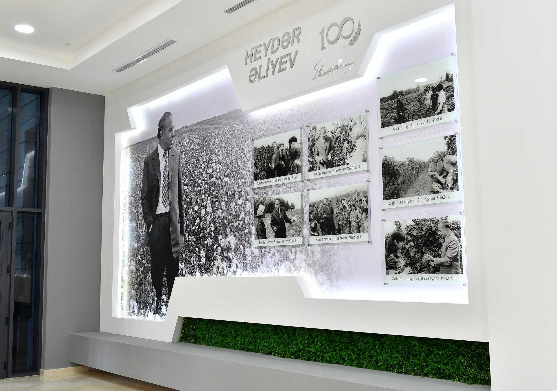 Qeyd edildi ki, burada Ümummilli Liderə həsr olunan xüsusi “Heydər Əliyev-100” guşəsi də yaradılıb. Bu il xalqımız müasir Azərbaycanın qurucusu Ulu Öndər Heydər Əliyevin 100 illik yubileyini qeyd edir. Ulu Öndərin Azərbaycanda aqrar sahənin inkişafı ilə bağlı gördüyü işlər guşədə geniş əks olunub.