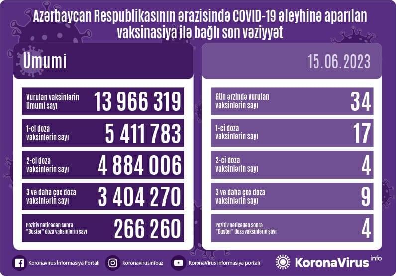 Azərbaycanda bu günə qədər vurulan vaksinlərin ümumi sayı isə 13 966 319 olub.
