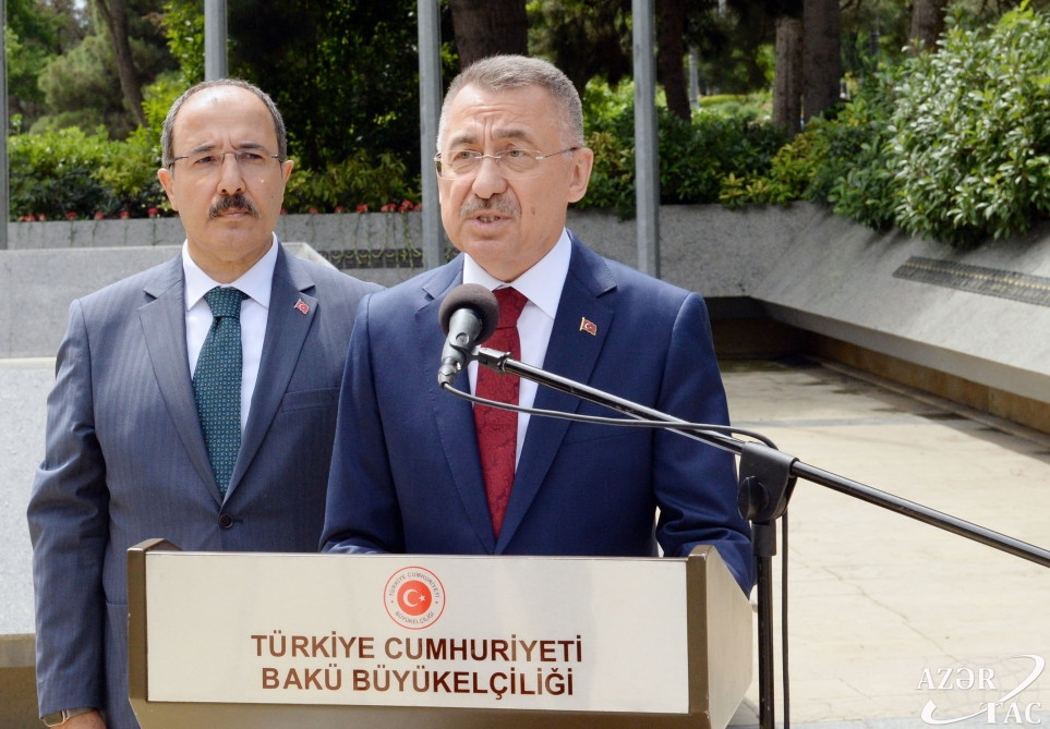"Türk şəhidliyi” abidəsinin Türkiyə və Azərbaycan qardaşlığının ən böyük nişanəsi olduğunu vurğulayan Fuat Oktay bildirib ki, bu müqəddəs məkanda uyuyan türk şəhidləri Qafqaz İslam Ordusunun mərd əsgərləri kimi azərbaycanlı qardaşları ilə birlikdə düşmənlərə qarşı vuruşub və hamının qəlbində ölümsüzlüyə yol açıblar. Vurğulanıb ki, uğrunda şəhidliyə ucaldıqları torpaq naminə birgə mübarizə Türkiyə və Azərbaycanın bir millət, iki dövlət olduğumuzu nümayiş etdirib. “Azərbaycanlılar da Çanaqqala müharibəsində bizim yanımızda olublar və qəhrəmancasına döyüşüblər. Bir əsr bundan əvvəl göstərilən qəhrəmanlıq və fədakarlıq Azərbaycanın 44 günlük haqq savaşında da təkrarlanıb. Bu amillər bizi əbədi olaraq bir-birimizə bağlayıb”, - o qeyd edib.