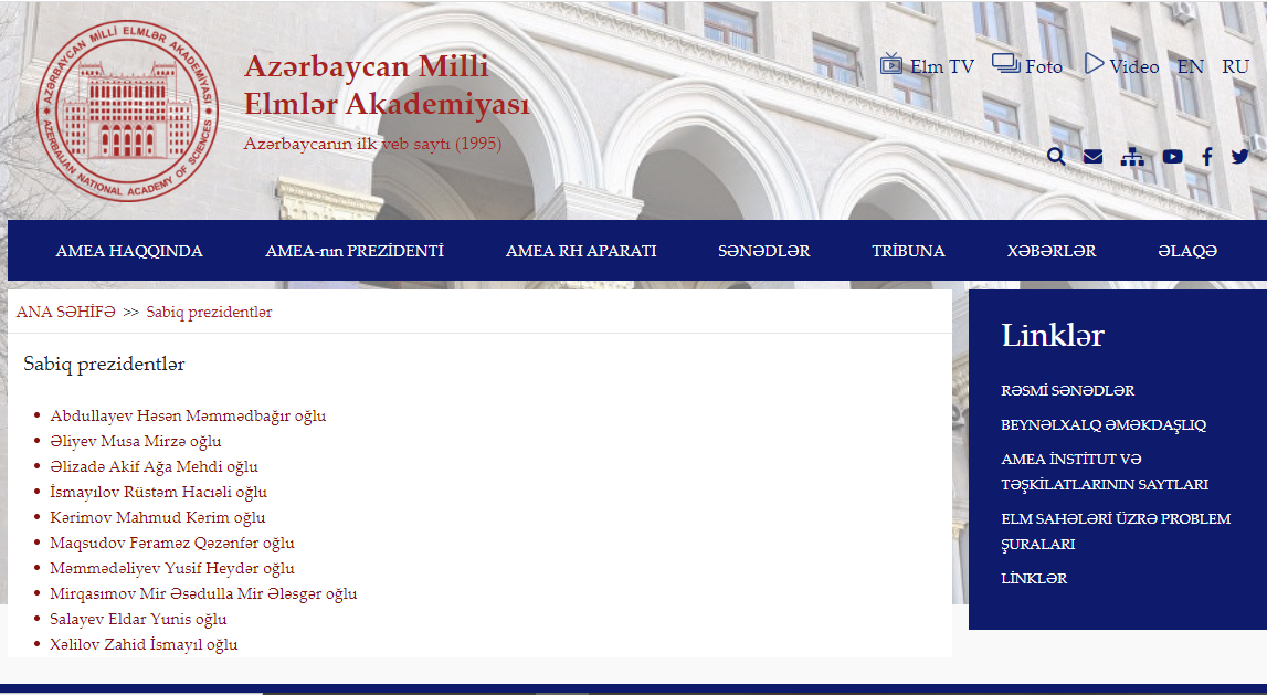 Dünən xəbər saytlarında Azərbaycan Milli Elmlər Akademiyasının (AMEA) eks-prezidenti Ramiz Mehdiyevin adı qurumun saytında sabiq prezidentlər siyahısında yer almadığına dair məlumat yayılıb.