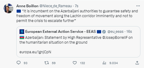 Mis.az xəbər verir ki, səfir tviter hesabında Laçın yolu ilə bağlı paylaşımda qeyd edib: "Azərbaycan hakimiyyəti Laçın dəhlizi boyunca təhlükəsizliyə və hərəkət azadlığına zəmanət vermək və böhranın daha da genişlənməsinin qarşısını almaq öhdəliyi daşıyır".