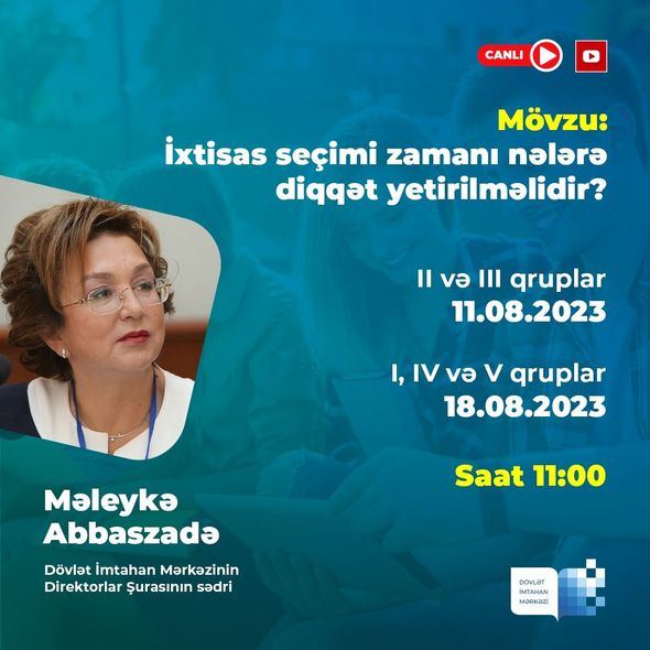 Dövlət İmtahan Mərkəzindən Mis.az-a verilən məlumata görə, Mərkəzin Direktorlar Şurasının sədri Məleykə Abbaszadə “Youtube” kanalı vasitəsilə ixtisas seçimi edəcək abituriyentlərə statistik məlumatlar əsasında diqqət yetirməli olduqları məsələlər haqqında məlumat verəcək.