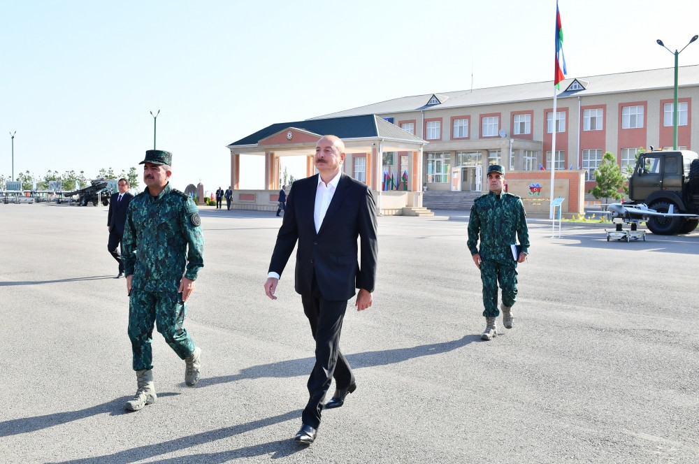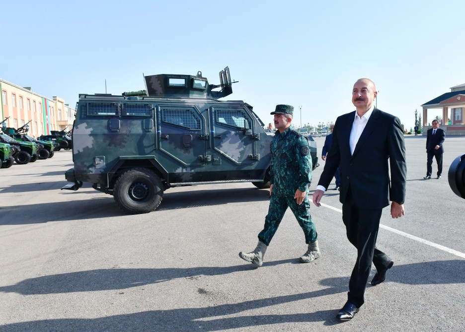 Dövlət başçısına, həmçinin “Qazax” Əlahiddə Sərhəd Diviziyasının xidməti istifadəsinə verilmiş silah arsenalı, döyüş texnikaları, yüksəkkeçidli nəqliyyat vasitələri, zirehli və avtomobil texnikası, tibb avtomobilləri nümayiş etdirilib.