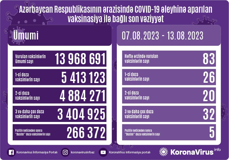 Bildirilib ki, bir gündə birinci doza üzrə 26, ikinci doza üzrə 20 vaksin vurulub. Üç və daha çox doza üzrə vaksinasiya olunanlar sayı 32 nəfərdir. Həmçinin pozitiv nəticədən sonra buster doza üzrə vaksinasiya olunanların sayı 5 nəfər təşkil edib.