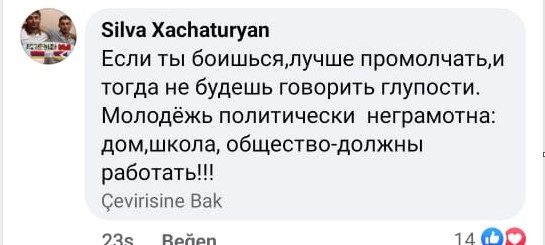Elen Arustamyanın ünvanına “axmaqlara təəccüblənməyin”, “əgər qorxursansa, boş-boş danışmaqdansa, susmaq daha yaxşıdır”, “Gənclər siyasi baxımdan cahildir”, “öküz, beyinsiz, nəyi yaxşıdır?” “Bu qız necə İrəvan universitetlərində təhsil ala bilər?”, “yum ağzını”, “təbrik edirəm, internet fenomenisən, bütün millət sənə lənət oxuyur” və s. şərhlər yazılıb.
