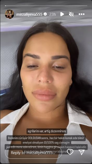 "Ağrılarım var, artıq dözə bilmirəm. Doğlulardan bədənim çürüyür. Heç bir həkim də kömək edə bilmir. Əməliyyat olunmalıyam. Sağ qalma şansım yüzdə ondur. Xahiş edirəm dua edin, kimin haqqına girmişəmsə haqqınızı halal edin".