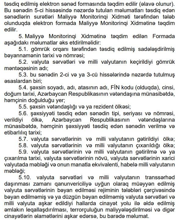 Bununla da, hökumətin "Maliyyə Monitorinqi Xidmətinə ölkəyə gətirilən və yaxud ölkədən çıxarılan valyuta sərvətlərinə dair təqdim edilən məlumatların tərtib olunma forması”nın təsdiq edilməsi haqqında” 28 iyul 2009-cu il tarixli qərarı ləğv edilib.