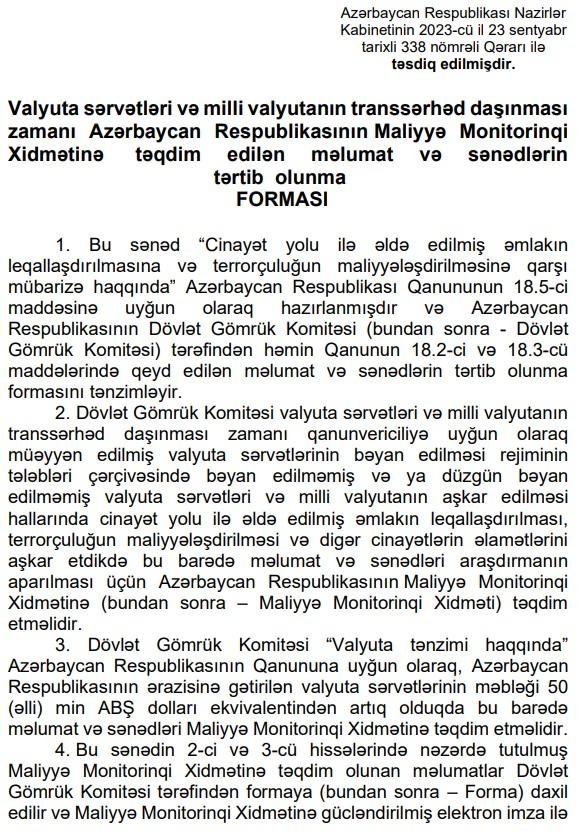 Nazirlər Kabineti “Valyuta sərvətləri və milli valyutanın transsərhəd daşınması zamanı Maliyyə Monitorinqi Xidmətinə təqdim edilən məlumat və sənədlərin tərtib olunma forması”nı təsdiq edib.