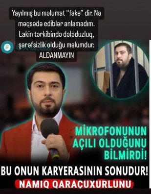 "Yayılmış bu məlumat "fake"dir (saxta). Nə məqsədlə edilibsə, anlamadım. Lakin tərkibində dələduzluq, şərəfsizlik olduğu məlumdur. Aldanmayın".