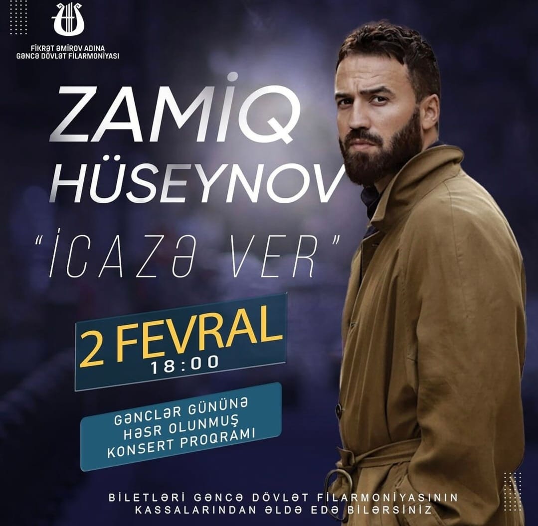Mis.az xəbər verir ki, müğənni Zamiq Hüseynov Gəncə şəhərində konsert verməyə hazırlaşır. Sənətçinin musiqili gecəsi gələn ilin 2 fevral tarixində Fikrət Əmirov adına Gəncə Dövlət Filarmoniyasında baş tutacaq.