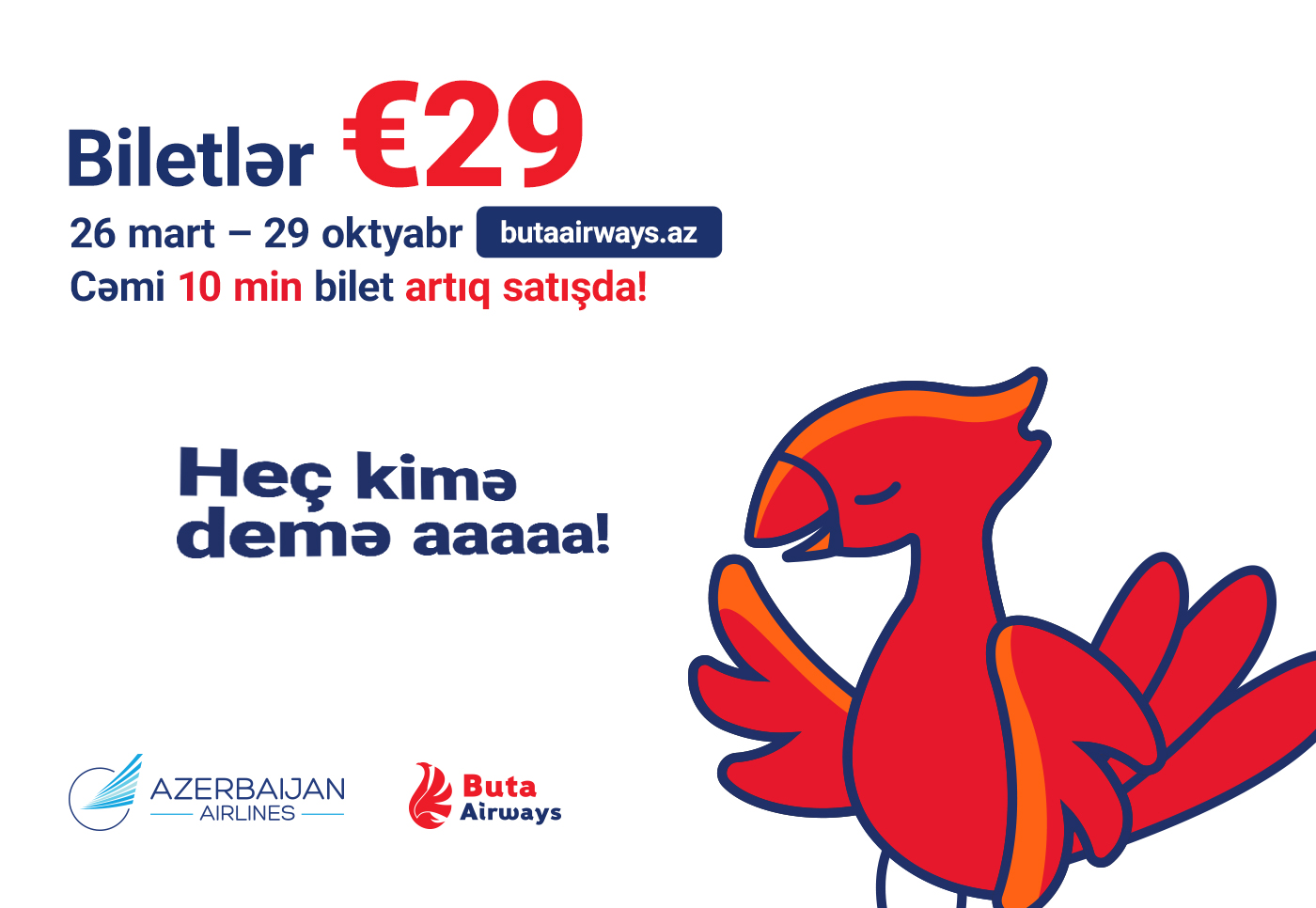 AZAL QSC-nin tərkib hissəsi olan aşağıbüdcəli “Buta Airways” aviaşirkəti bu gün saat 16:00-da bütün hava limanı rüsumları daxil olmaqla, minimal “Büdcə” tarifi ilə 29 avroya 10 000 biletin onlayn satışına başlayacaq.