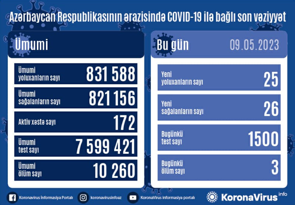 Azərbaycanda son sutkada koronavirus infeksiyasına 25 yeni yoluxma faktı qeydə alınıb, 26 nəfər müalicə olunaraq sağalıb.