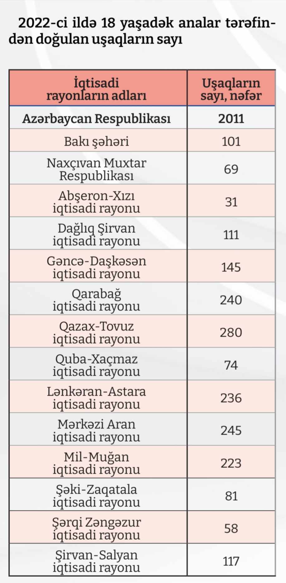 Azərbaycan üzrə 2022-ci ildə 18 yaşınadək analar tərəfindən doğulan uşaqların sayı 2011 nəfərdir.