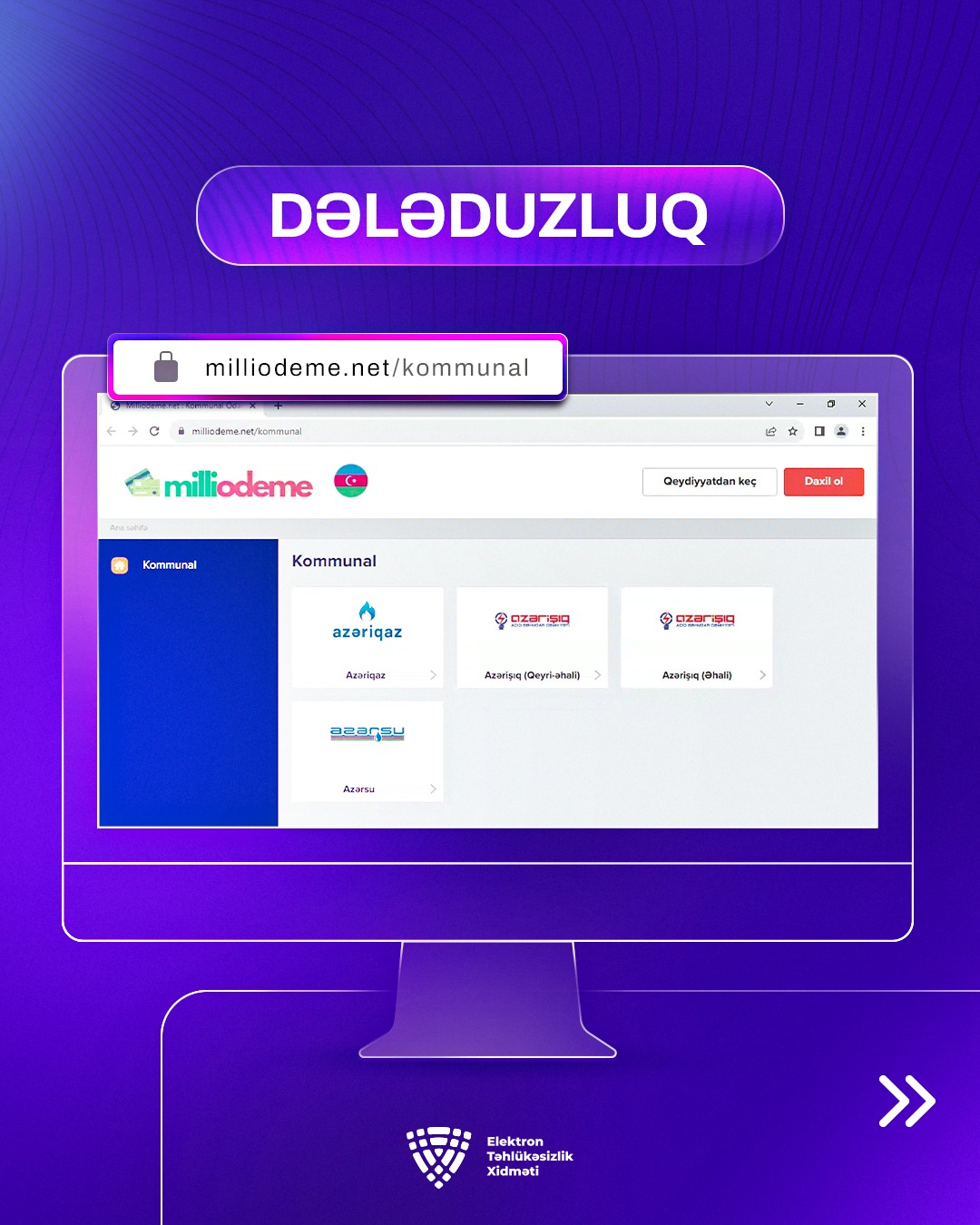 "Elektron Təhlükəsizlik Xidməti vətəndaşlara belə saxta veb-səhifələrə etimad etməməyi, şübhəli keçidlər vasitəsilə bank kartı və digər fərdi məlumatlarını qarşı tərəfə təqdim etməməyi, yalnız rəsmi ödəniş portalları vasitəsilə ödəniş etməyi tövsiyə edir", - deyə məlumatda qeyd olunub.