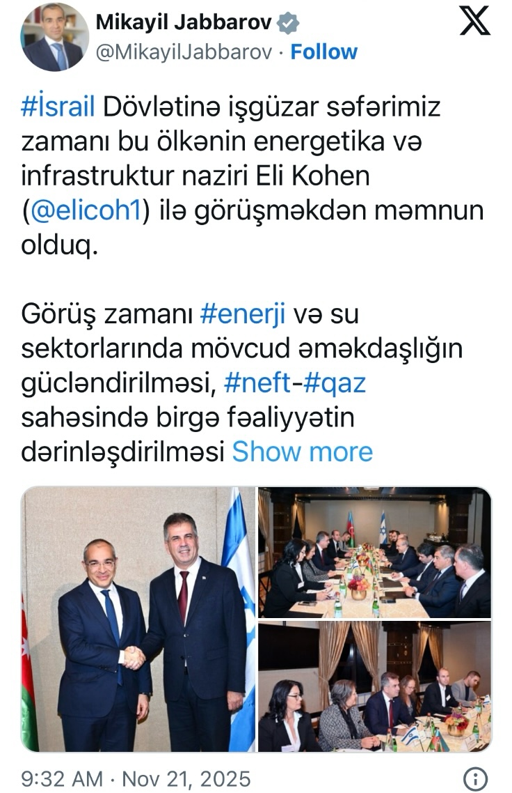 "İsrail Dövlətinə işgüzar səfərimiz zamanı bu ölkənin energetika və infrastruktur naziri Eli Kohen ilə görüşməkdən məmnun olduq. Görüş zamanı enerji və su sektorlarında mövcud əməkdaşlığın gücləndirilməsi, neft-qaz sahəsində birgə fəaliyyətin dərinləşdirilməsi barədə fikir mübadiləsi apardıq".