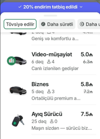 Belə ki, bu kateqoriyadan sifariş verən sərnişinlər üçün səfər zamanı audio və video yazı aparılacaq, real vaxtda onlayn agent dəstəyi göstəriləcək. Həmçinin yaxınları üçün taksi sifariş edən sərnişinlərə əlavə rahatlıq və nəzarət imkanı yaradılacaq.
