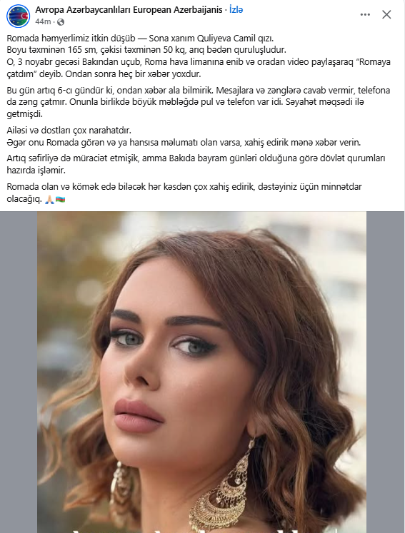 Azərbaycan vətəndaşı olan Sona xanım Quliyeva Camil qızı Romada itkin düşüb.