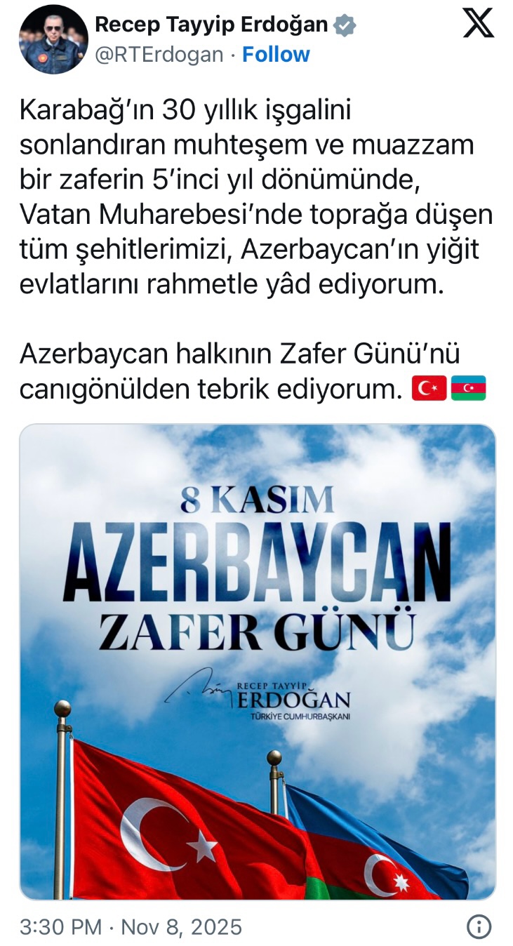Türkiyə Prezidenti Rəcəb Tayyib Ərdoğan Azərbaycanı Zəfər Günü münasibəti ilə təbrik edib.