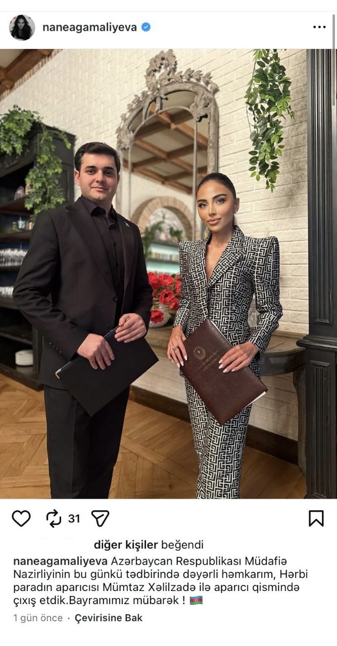 Zəfər Günü münasibətilə keçirilən hərbi paradı yalnız Mümtaz Xəlilzadə aparıb. Nanə Ağamalıyeva isə paraddan sonra Müdafiə Nazirliyinin restoranlardan birində təşkil etdiyi ziyafətdə Mümtaz Xəlilzadə ilə birgə aparıcılıq edib. Onun paylaşdığı foto da həmin ziyafətdə çəkilib.