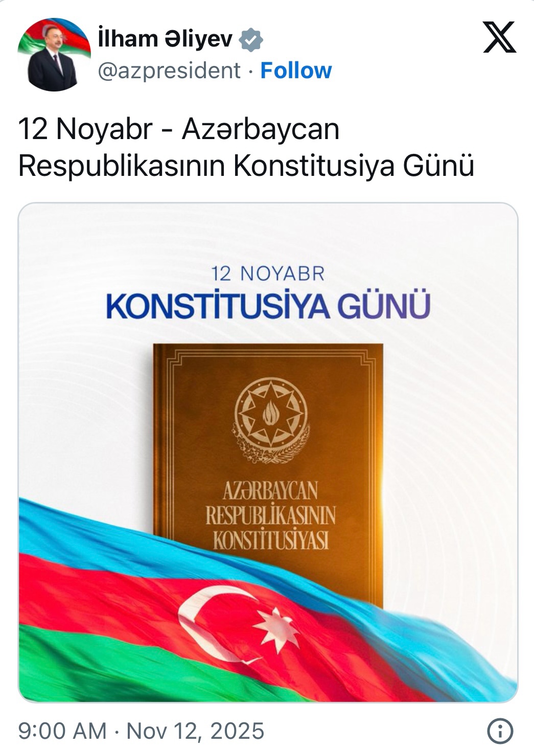Prezident İlham Əliyev 12 Noyabr - Konstitutsiya Günü ilə bağlı paylaşım edib.