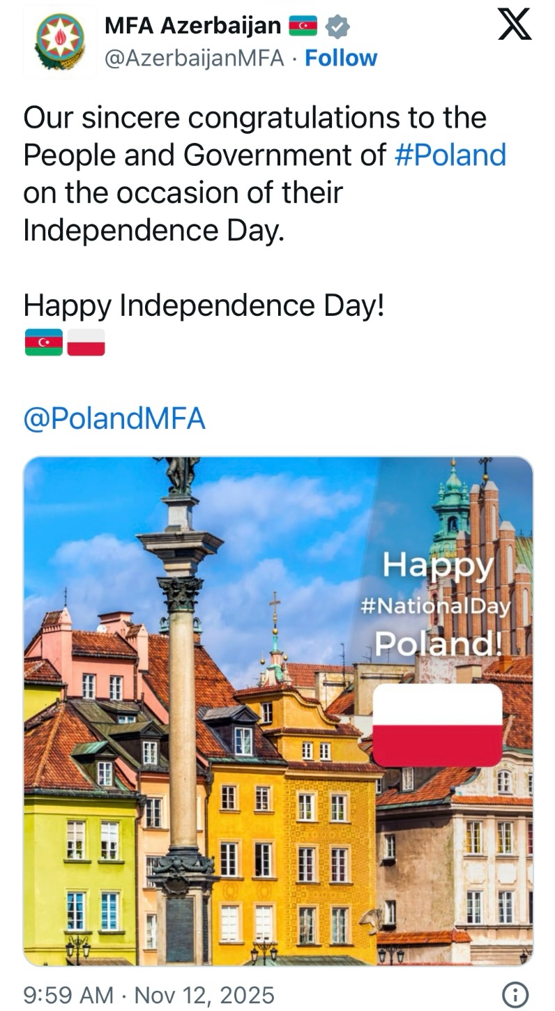 "Polşa xalqını və hökumətini Müstəqillik Günü münasibətilə səmimi qəlbdən təbrik edirik. Müstəqillik Gününüz mübarək!"