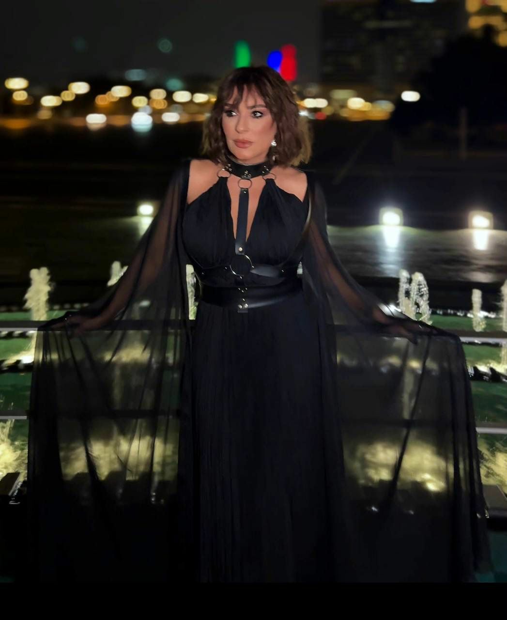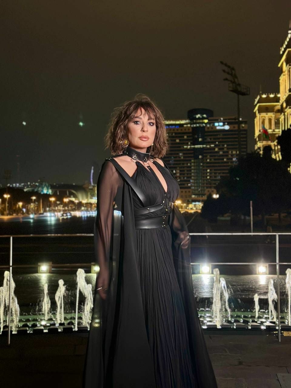 Mis.az xəbər verir ki, pop ulduz bu dəfə qotika tərzində görüntülənib. Özəl olaraq ulduz üçün hazırlanan libasın kürək hissəsində T/A loqosu da diqqət çəkib.Geyimin müəllifi yerli markamız olan “Dentel Couture” məxsusdur. Xalq artistinin üzərindəki aksesuar isə Neijan Malik imzası daşıyır.