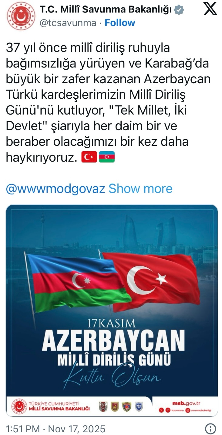 Türkiyənin Milli Müdafiə Nazirliyi Azərbaycanı 17 Noyabr – Milli Dirçəliş Günü münasibətilə təbrik edib.